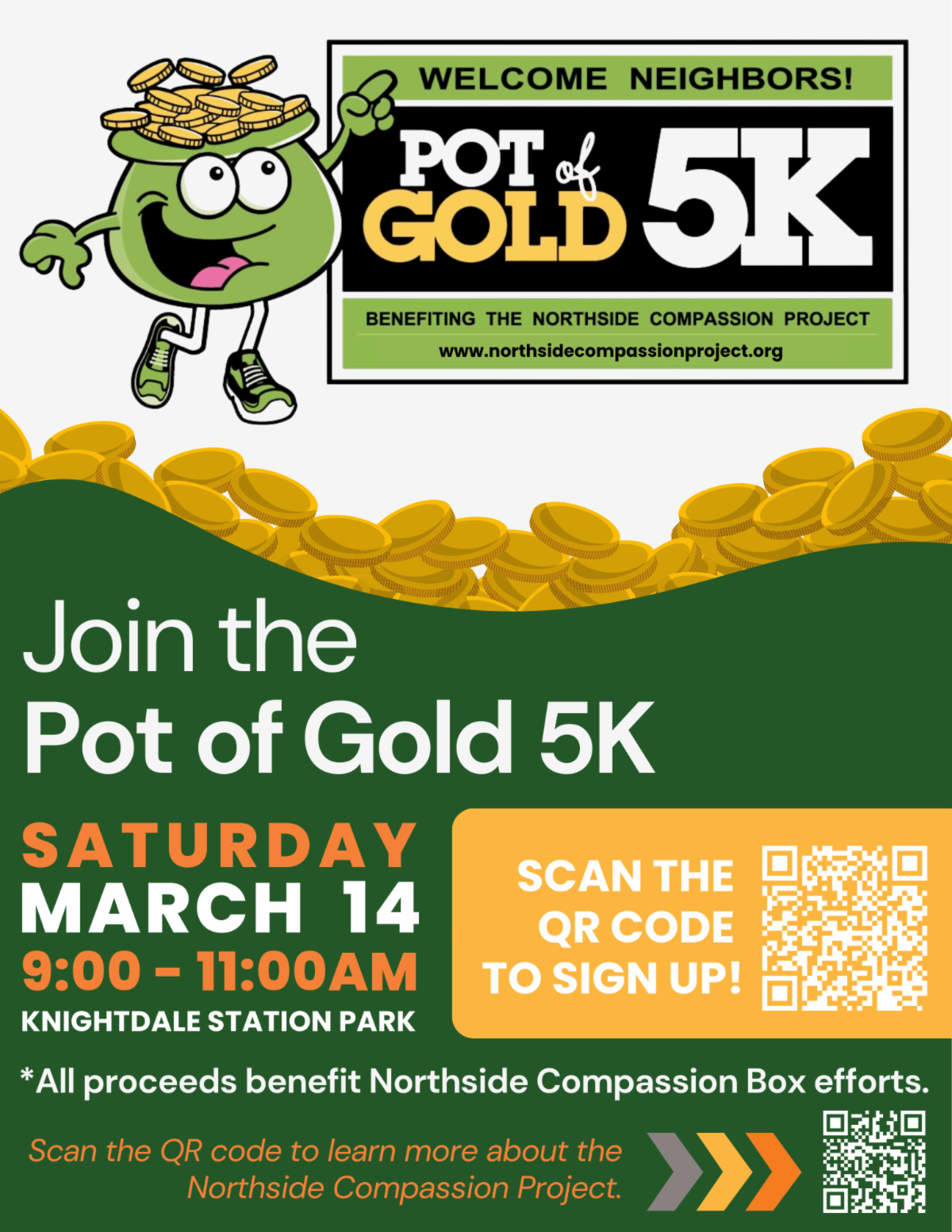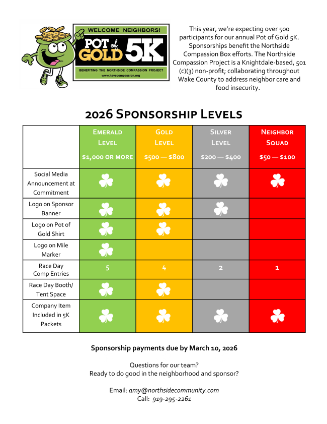 Registration is open for our 9th Annual Pot of Gold 5K at Knightdale Station Park! Cost is $35.00 per person. Registration includes a Pot of Gold 5K Shirt, finisher's medal, locals' swag & race day photos. T-shirt availability is only guaranteed through 2/21/26. We're limited to 500 registrations. Sign up soon and support the work of the Northside Compassion Project!